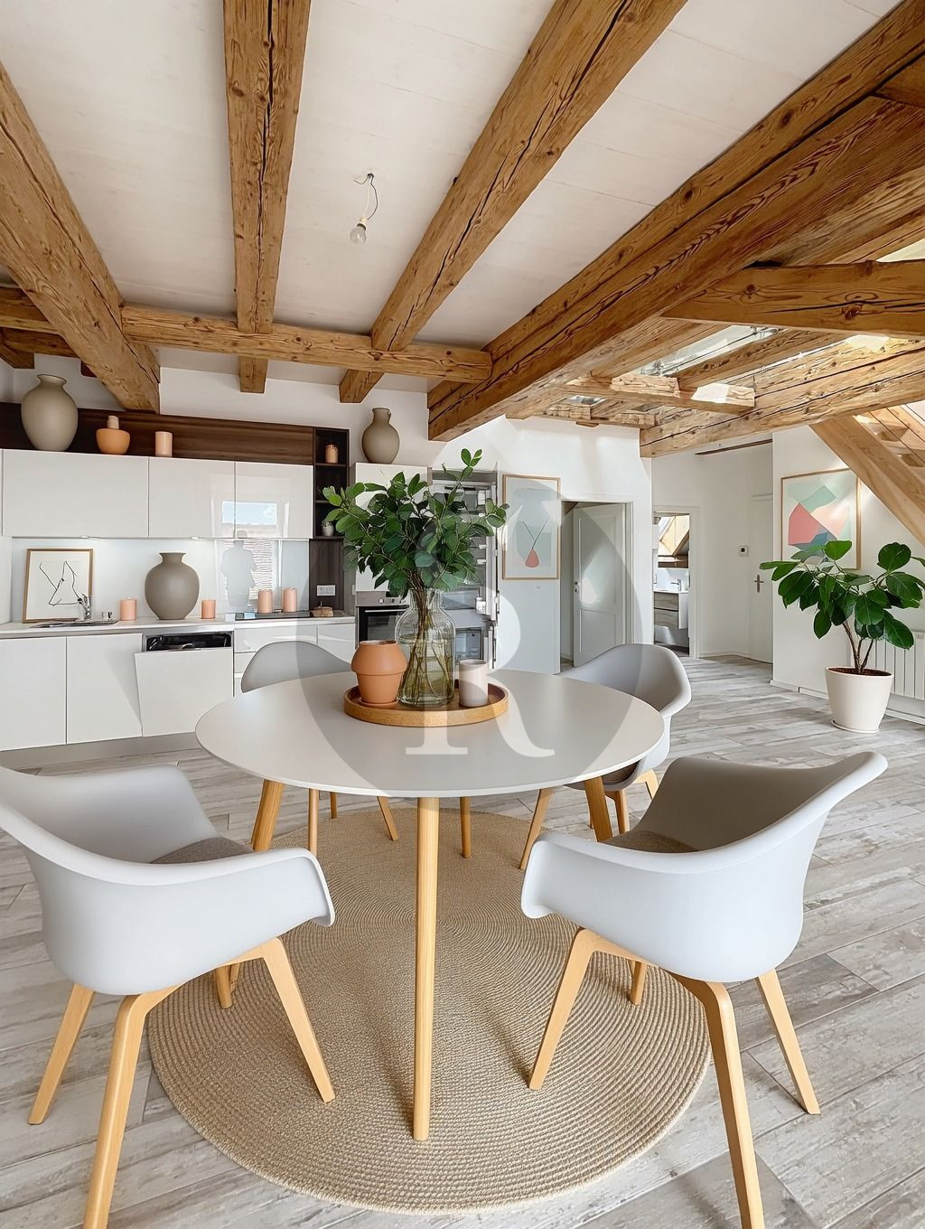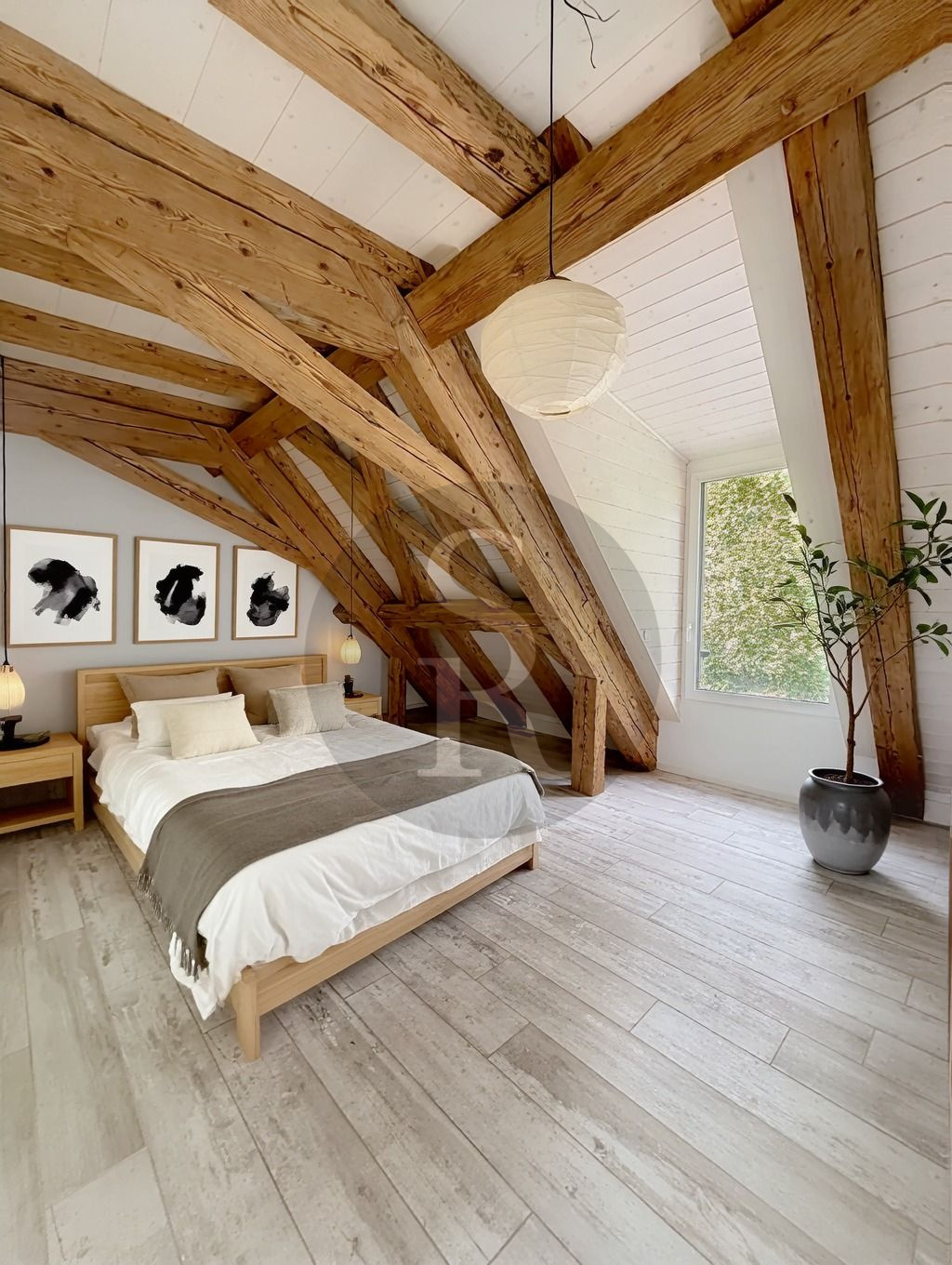 Dès l’entrée, le regard est captivé par la charpente apparente qui confère à l’espace une authenticité chaleureuse et un cachet unique. Le jeu de lumière et la vue sur les toits du bourg et le Lac apportent une dimension unique à ce logement.